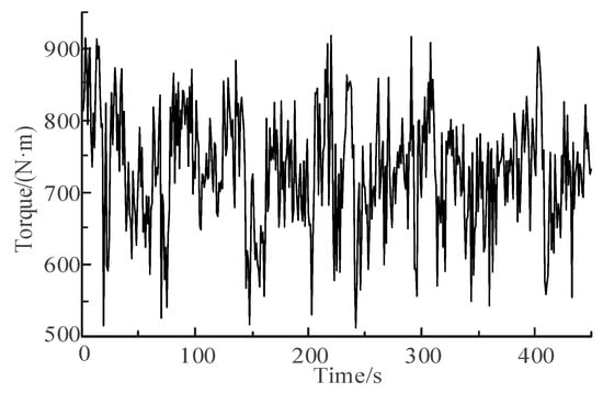 Based on the torque testing process of the rotary tillage experiment, the PTO torque values during the rotary tilling operation are collected through the load acquisition systems, and a complete set of time-domain torque load samples was obtained after preprocessing, as shown in Figure 10.