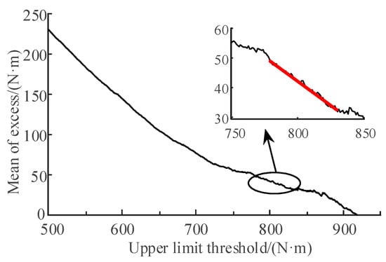 The mean excess function for the time-domain load is reconstructed to generate a load sequence that meets the target length. This sequence is then used to calculate the average exceedances, which are subsequently utilized to select the optimal upper and lower threshold intervals employing the mean excess function method. For the upper threshold, the MEF is plotted in Figure 11.