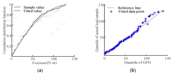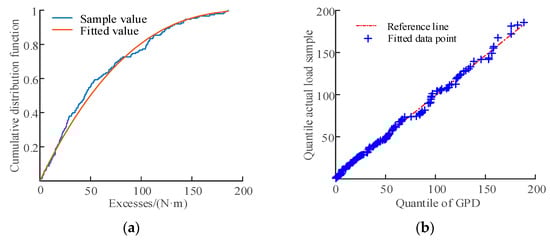 As mentioned previously, the extrapolated method identifies the recommended scale and shape parameters, determines the threshold for load data, and subsequently fits the extreme value data. Nonetheless, the applicability and quality of the GPD fitting remain uncertain. In addition to drawing cumulative distribution function (CDF) curves for correlation analysis, the quantile–quantile (Q-Q) plot is introduced to evaluate the fitting effect.