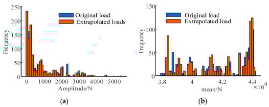 The histogram can be plotted based on rainflow statistics data for deep loosening; as shown in Figure 19, the correlation coefficient of amplitude is 0.9985, and the coefficient of the mean is 0.9945, which proves the extrapolation data are believable. The maximum and minimum values of the extrapolated load are 44,392 and 38,177, respectively, and the amplitude corresponding to the maximum frequency is 233.75, and the mean is 44,074.25. These data are the real load spectrum under the deep loosening mode.