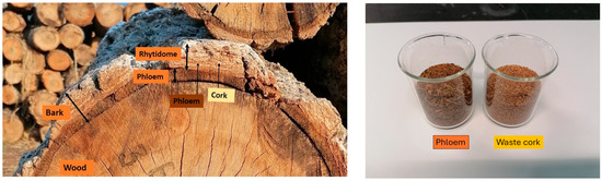 Bark of mature Quercus cerris trees showing the inner bark (phloem) and the rhytidome-containing phloem tissues (dark brown color), and cork tissues (light brown color) on the left. The ground waste cork and phloem samples used in this study are shown on the right.