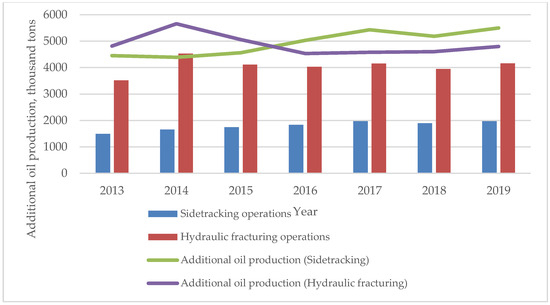 The dynamics of the number of sidetracking operations over a seven-year period, as presented in Figure 1, demonstrates that, during the period under consideration, the additional oil production increased by 1050, i.e., from 4450 to 5500 tons/year, which is 23%. Analyzing this graph, we also see that, for one sidetracking operation, there is a greater number of hydraulic fracturing operations at almost the same volume of additional oil production. Moreover, if we take into account only the beginning and the end of the studied interval, we observe that the volume of additional oil production obtained by hydraulic fracturing remains approximately at the same level, which proves the better efficiency of sidetracking in relation to hydraulic fracturing.