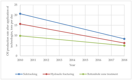 If we analyze the oil flow rates obtained from re-entered wells, we observe a decrease of 13 tons per day over ten years, namely from 42 tons per day in 2008 to 29 tons per day in 2018, i.e., by about 30% [14].
