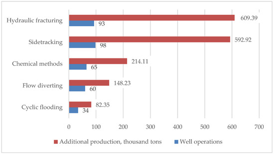 The results for the studied object are presented for 350 wells with additional oil production of 1647 thousand tons as a result of the application of EOR; see Figure 3.