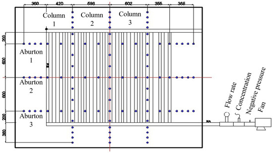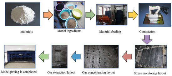 The construction process of the three-dimensional physical similarity experimental model is shown in Figure 2. First, the materials are carefully screened to ensure that the experimental aggregate sand meets the required particle size. Then, the sand, cement and starch are weighed to an appropriate amount, put into the mixing system of the experimental system, and combined with an appropriate amount of water for stirring. Next, the mixed material is transported to the experimental box by a feeder, and the material is evenly laid in the box. The material is compacted with a tamping hammer to a predetermined thickness, and the surface is evenly sprinkled with mica sheets to simulate rock separation. After laying one layer, the next layer is laid according to the coal rock histogram until the whole three-dimensional model is completed. When the model is built, according to the experimental scheme, the stress, gas concentration, microseismic sensor, gas drainage pipeline, etc. are embedded in the predetermined layer of the three-dimensional model. The 3D experimental model is dried for 6 months after being laid to ensure that it is free from the effects of water, allowing us to maintain consistent conditions throughout the study. After the model completely dries, experiments related to coal seam mining operations are conducted. No sealants are used during the process to preserve the natural behaviors of fissure formation and gas migration in the overburden.