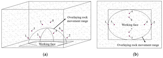 During the mining process of the working face, the original stress balance state inside the three-dimensional physical similarity simulation model is destroyed, and the rock strata in the mining space are fractured and damaged, releasing elastic strain energy and generating microseismic signals. The source energy is transmitted in the form of elastic waves. To accurately locate the microseismic signal and receive it, eight sensors are used in the test, and the layout design is shown in Figure 4. In order to accurately capture the vibration signal in three-dimensional space and determine the vibration position, the sensors of adjacent layers are staggered. To prevent the sensor from being suspended after the collapse and to effectively receive the seismic signal, the sensor is arranged outside the collapse area.