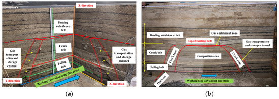 Through the experimental cutting, it can be seen that the three-dimensional physical similarity simulation experiment can better reflect the process of breaking, caving, and re-compaction of the overlying strata after coal seam mining. In the three-dimensional cutting map, the strike and tendency fracture zone can be clearly divided, as well as the range of fracture compaction zone and bending subsidence zone. With the cutting of the model, the separation phenomenon occurs about 65 m from the coal seam floor, at the top of the overburden fracture zone, and the bottom of the bending subsidence zone. The rock stratum is relatively broken 25 m from the coal seam floor. Therefore, in the height direction, the caving zone is within 25 m of the coal seam floor, which is 4.8 times the mining height; the fracture zone is 25–65 m away from the coal seam floor, which is 12.5 times the mining height, and the top of the fracture zone is rich in separation cracks. The distance from the coal seam floor is greater than 65 m, making it a curved subsidence zone. In Figure 4, the X-direction is the inclined direction of the coal seam, and the Y-direction is the advancing direction of the working face. The Z-direction is the height direction of the coal seam, and the overall collapse form is an ellipsoid. The main channel for gas migration and storage is between the inner and outer ellipsoids, and an obvious masonry beam structure is formed at the edge of the ellipsoid.