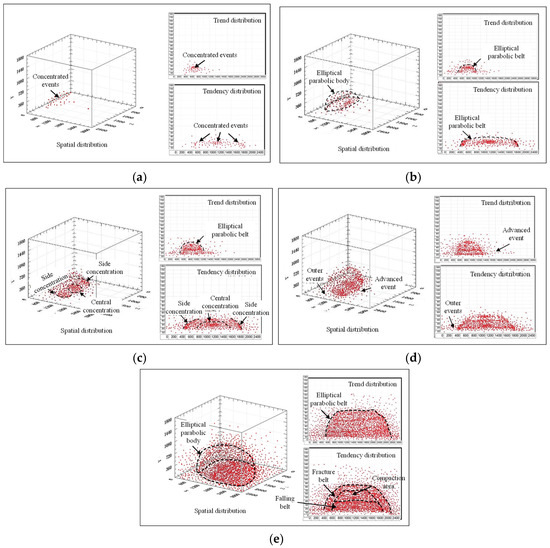 Spatial distribution of microseismic events within 200 m of working face advancing: (a) 21 m; (b) 45 m; (c) 64 m; (d) 81 m; and (e) 200 m.