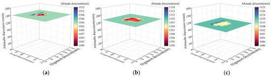 From Figure 7, the overlying strata in the goaf sink 150 m away from the roof of the coal seam, and the subsidence and subsidence range are relatively small. The maximum subsidence at 150 m of the overlying strata is 1.1 m, the subsidence range is concentrated in the small area of the goaf, and the subsidence shape is irregular oval. The maximum subsidence of the overlying strata 130 m away from the coal seam floor is 1.2 m, the subsidence range expands, and the subsidence shape is irregularly oval. The maximum subsidence of the overlying strata 88 m away from the coal seam floor is 1.5 m, and the subsidence area is further expanded. The subsidence shape is irregularly elliptical, and there is an uplift phenomenon in a small area of the rock layer outside the subsidence area. The maximum subsidence of the overlying strata 72 m away from the coal seam floor is 1.5 m, and the subsidence range is basically similar to that at 88 m, showing an irregular oval shape. The maximum subsidence of the overlying strata 64 m away from the coal seam floor is 1.7 m, the subsidence range is further expanded, and the shape is irregularly elliptical. The maximum subsidence of overburden strata 53 m away from the coal seam floor is 3.3 m, and the subsidence range is further expanded. The subsidence slope area is relatively long, the central compaction area is relatively flat, and the overall shape is irregularly oval. The maximum subsidence of the overlying strata 39 m away from the coal seam floor is 4.0 m, the subsidence range is further expanded, and the subsidence slope area is further extended. From top to bottom, the subsidence range of the overlying strata continues to expand, and the subsidence slope area gradually extends. The central compaction area is relatively flat, and the overall shape shows an irregular oval shape.