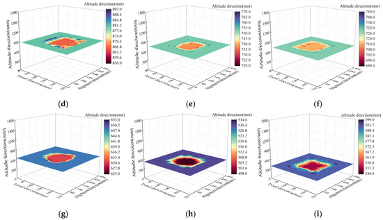 Coal seam mining overlying strata subsidence range and subsidence amount: (a) 150 m; (b) 130 m; (c) 120 m; (d) 88 m; (e) 72 m; (f) 64 m; (g) 60 m; (h) 53 m; and (i) 39 m.