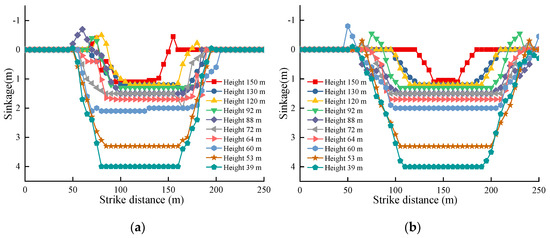 To accurately analyze the subsidence of each layer of overlying strata after coal seam mining, a measuring point is arranged every 5 cm along the strike and tendency during the model cutting process to test the subsidence. The subsidence of each layer is determined by layer-by-layer statistics, and the middle of each layer along the tendency and direction of the working face is plotted and analyzed, as shown in Figure 8.