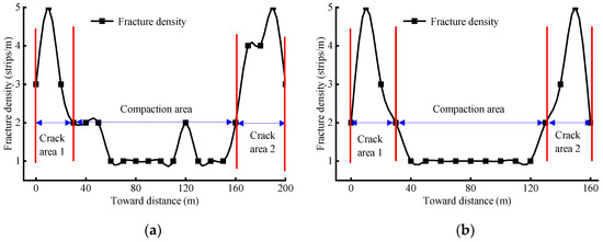 Distribution of fracture density in mining strata. (a) Trend of fracture density distribution and (b) tendency of fracture density distribution.