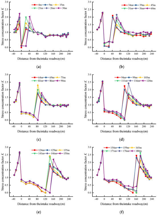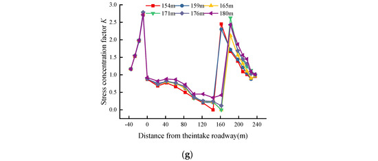 According to Figure 11, in the stress unloading area, stress critical area, and stress concentration area along the coal seam, the bottom plate stress is high at both ends and low in the middle, and stress concentration is found in a certain area of the inlet and return airway. The stress concentration along the tendency direction exhibits a saddle shape. As can be seen from the above figure, the sensor buried in the coal wall 9 m away from the air inlet and return airway is located in the peak position. When the working face advances to 86 m, the region 102 m ahead of the longitudinal column of sensors is affected by the mining process. In the middle of the working face, the stress concentration coefficient is 1.64. The maximum stress concentration coefficient of the coal wall of the air inlet lane is 1.66. Moreover, the return airway in the coal wall has a stress concentration coefficient of 1.66. The stress peaks at the two ends are equal.