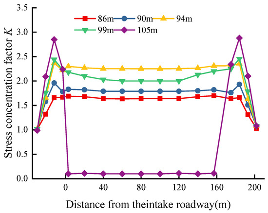 The distribution of the stress concentration coefficient when the two longitudinal sensors are pushed 86–105 m away from the working face is shown in Figure 11.