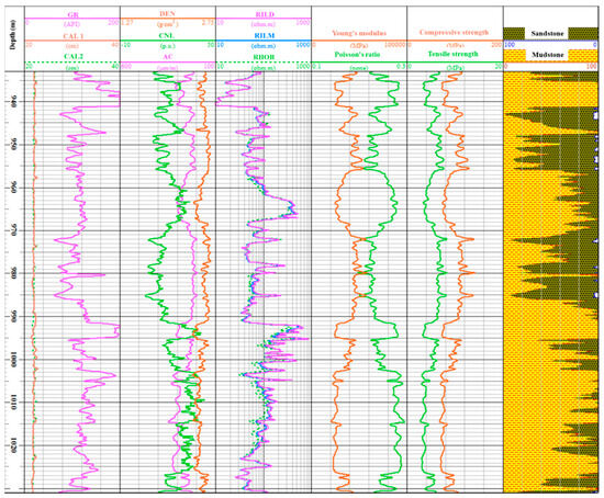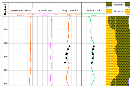 In order to verify the usability of the transformation models in Figure 1, we compared the core test results with the rock mechanical curves determined by Equations (3) and (4). Based on these models and the logging data of the parent well, the curves of Young’s modulus and Poisson’s ratio at a depth of 643–645 m are presented in Figure 1; the core test results at the same depth (the black dots) present a good correlation with the curves. This is an indication of the accuracy of these transformation models. We applied these models to the entire well section of the parent well. Figure 2 shows the rock mechanic parameter curves in the depth range of 940–1030 m.