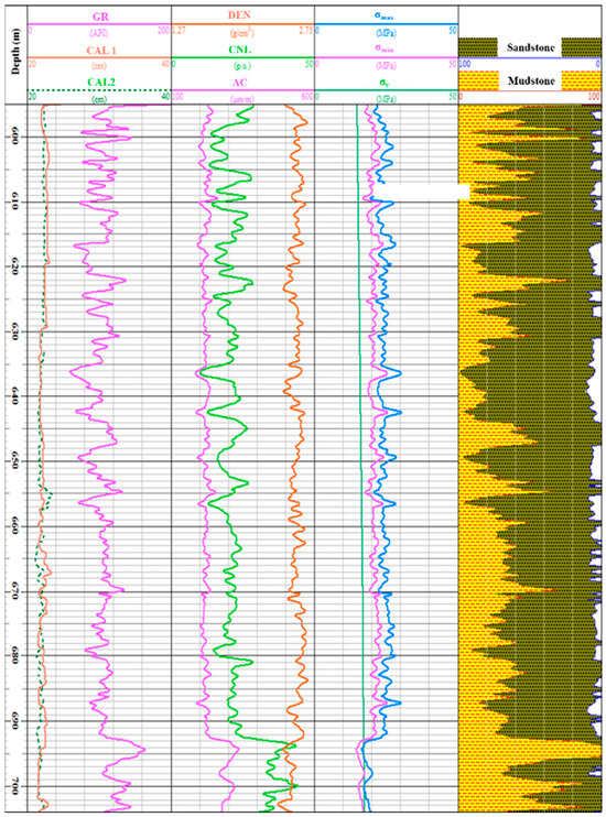 In this work, nineteen core samples were collected from the parent well in a sand–mudstone interlayered reservoir in the Junggar Basin for a rock mechanic test. Cylinders with a diameter of 25 mm and a length of about 50 mm were prepared. In the experiment, the loading speed of the samples was 0.005 mm/min, and the samples were cut from a drill core. For the uniaxial test, the cylinders were placed in the loading cell; then, the axial load increased at a constant rate. The stress–strain curves were recorded along this process. The test results on the 10 rock samples are shown in Table 1.