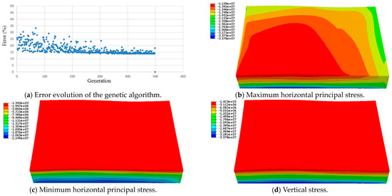 In this work, numerical inversion was accomplished by a genetic algorithm in MatLab, 2020. The boundary vectors are noted as input parameters, and the geostress components, , calculated by the finite element method, are noted as output parameters. The initial error decreased gradually with the genetic generation (Figure 4a); after the inheritance was conducted to the 500th generation, the inversion accuracy rate reached 93.3%. The inversed 3D principal stress fields of an 8.0 × 5.0 km2 area at a depth of 100–1200 m are presented in Figure 4b–d.