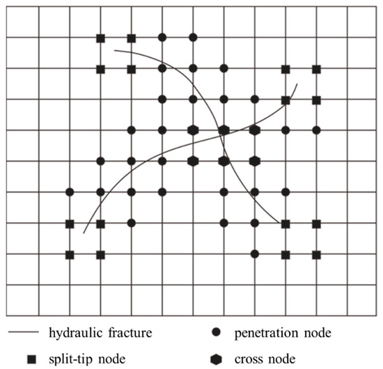 The extended finite element method (XFEM) uses the level set method or the fast advance method to introduce the modification of the shape function within the unit. The continuous function was used to characterize the continuous region, and the enhanced function was used to represent the non-continuous region. The introduced enhancement functions mainly include three functions: the Heaviside function to characterize the discontinuity of the displacement field, the Junction function to characterize the fracture crossing, and the fracture tip increase function to characterize the fracture tip singularity field. The corresponding unit types are the penetration node, the cross node, and the split-tip node (Figure 5).