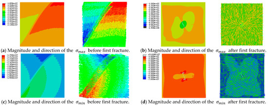 At the beginning of the fracturing process, a fracture propagates in the direction of the perforation. After the fracture length reaches about 10 times the length of the borehole’s diameter, it propagates along the direction of the maximum principal stress, and thus forms a turning fracture. The induced stress was tensile at the fracture tip; in the normal direction of the fracture length, it was compressive. This induced compressive stress changes the stress state near the fracture; the direction of changed from NNW–SSE to E–W (Figure 7b). The direction of the minimum horizontal principal stress before and after the initial fracturing changes accordingly (Figure 7d). However, the direction of the horizontal principal stress near the fracture tip was not significantly affected; for this reason, the propagation direction of the fracture was not affected by the induced stress.
