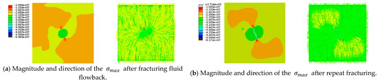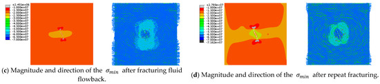 After the fracturing fluid flowback for 360 min, the pore pressure near the fracture dropped by about 3~5 MPa; the magnitudes of and changed accordingly, but their directions were not affected. The fracture morphology did not change significantly during the flowback process (Figure 8a,c). Then, during the repeated fracturing process at well L25, the fracture width gradually increased in the first 20 min, but the fracture length did not change significantly. After 30 min, the fracture continued to propagate along the direction of the maximum principal stress; this range is influenced by fracturing-induced stress, which further expands here (Figure 8b,d).