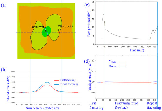 (a) The “butterfly type” area affected by fracturing-induced stress; the checkpoint is located 200 m east of the parent well. (b) The affected range after the first fracturing process and repeat fracturing in the E–W direction. (c) Fluid pressure variation at the parent well. (d) Principal stresses variation at the checkpoint during the fracturing of the parent well.