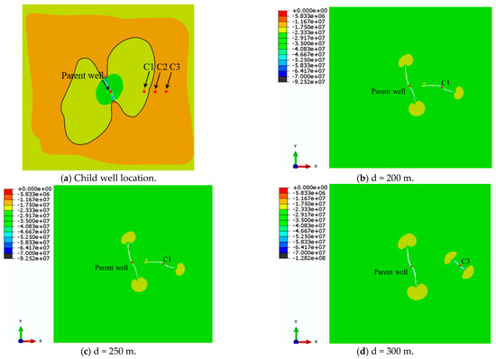 In the candidate child well location, the induced stress field was superimposed onto the in situ stress field; this stress state change can significantly impact the fracturing of the child well. Here, we present several child wells in different locations to illustrate how inter-well interference affects the fracture wings of the child well. After the parent well repeatedly fractured, a child well fracturing was conducted for d = 200 m, d = 250 m, and d = 300 m, where d represents the distance from the child well to the parent well on the E–W direction. Figure 10 presents the fracture geometry after fracturing at the child well for 100 min, with a flow ratio of 2 m3/min; the fracture width (white curve) was magnified 50 times for visualization. Child well C1 is located within the “butterfly type” zone in Figure 9a, while child wells C2 and C3 are located outside this zone. As shown in Figure 10b, the left fracture wing of the child well propagates in the east–west direction, which is significantly affected by the compressive stress induced by parent well fracturing; meanwhile, the right wing propagates in the northwest–southeast direction and thus present asymmetric fracture propagation. When the child well is located outside the “butterfly type” zone, Figure 10c,d present the symmetric fracture geometry. The effect of stress interference on the asymmetry of child well fracture wings was negatively correlated with d.