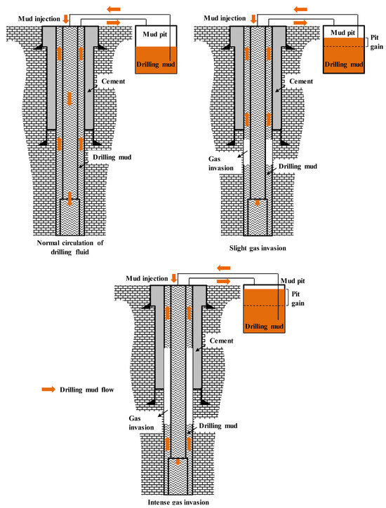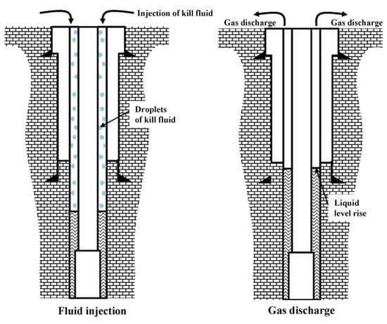 Nevertheless, a series of issues or accidents that endanger the safety of the development operation are extremely likely to occur during oil and gas production in the ocean (especially in deep-water areas) [22,23,24,25]. Among them, gas kick (or blowout), which is likely to occur during the drilling operation in high-pressure gas reservoirs, is a typical one [26,27,28]. This issue is caused by the invasion of high-pressure gas from the reservoir into the wellbore annulus under the negative pressure difference between bottom-hole pressure and reservoir pressure [29,30]. For gas wells in deep-water areas, the circulation pipeline of drilling fluids is extremely long, and high-pressure gas in the annulus continuously expands during its migration to the platform [31,32]. The excessive annular pressure caused by gas expansion not only affects the integrity of the wellbore in weak positions, such as casing shoes, but also leads to blowout. Undoubtedly, the severe gas kick naturally poses a significant threat to the drilling operation. For most ordinary wells, gas kick can be effectively controlled by the conventional well killing methods (such as the driller’s method) as long as it was detected in time [33,34]. However, conventional well killing methods are occasionally inadequate for controlling gas kick and blowout occurs in gas wells in deep-water areas. The common conventional methods, such as the driller method, are suitable for drilling operations in areas with simple geological conditions and a well-defined pressure system. However, the geological conditions and pressure systems of oil and gas reservoirs, especially gas reservoirs in deep-water areas, are complex [35,36]. This is especially true in scenarios where the drill string is absent from the wellbore or the drill bit is positioned near the wellhead. In other words, conventional well killing methods are not suitable for well control of oil and gas wells in deep-water areas [37].
