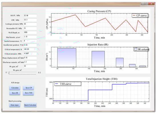 In this study, a preliminary program for design and calculation of kill parameters was compiled with VB.NET when the displacement kill method was used, and the kill operation was simulated. With this program, the variation pattern of kill parameters (such as annulus pressure and total injection volume) in the kill operation when the displacement kill method was used were explored. The program interface is shown in Figure 4. From Figure 4, it can be identified that although the interface of this program is simple, it is fully functional. Based on this program, the influence of various factors affecting kick control with the displacement kill method can be explored. Moreover, the simulation results obtained using this program can provide reference for the design of the well killing operation.