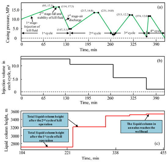 Only through an in-depth analysis of the variation patterns/characteristics of kill parameters during kill operations can the related design of kill operations be executed more effectively. The evolution of casing pressure, injection volume, and liquid column height during kill operations was investigated for the case of considering kill fluid leakage, and the results was presented in Figure 7. As observed in Figure 7, three stages are involved in any kill cycle: the injection of kill fluid, fluid fall, and the discharge of invading gas in the annulus. The function of the first two stages is to allow the kill fluid to be injected into the annulus and occupy part of its space. However, it should be noted that the sum of the hydrostatic pressure and the casing pressure must not exceed the leakage pressure. The final stage of each cycle is to release the compressed gas in the annular space. Notably, when the gas is released in each cycle, the sum of the casing pressure and the hydrostatic pressure cannot be lower than the formation pressure. The duration of the three stages involved in one cycle varies. In the first cycle in Figure 7, the duration of the injection stage is 94.9 min, and the duration of the discharge is only 32.5 min. The latter is obviously faster than the former. The fall of the kill fluid from the wellhead to the gas–liquid interface in the annulus occurs along with the first stage, the duration of this stage is 19.5 min in the first cycle. For the default investigation case, almost all the gas invading the annulus can be completely displaced through four rounds of the above-mentioned kill cycle using the displacement kill method. The entire kill operation takes about 420 min.