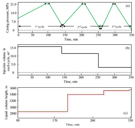 Figure 8 presents the evolution of casing pressure, injection volume and liquid column height during kill operation when no kill fluid leakage occurs. By comparing Figure 7 and Figure 8, it can be clearly observed that the duration of the kill operation is significantly shortened in the absence of kill fluid leakage. Without kill fluid leakage, the gas in the annulus can be completely discharged in just 350 min, which is 70 min shorter than the result displayed in Figure 7. This should be attributed to the lower amount of injected kill fluid when there is no leakage. Consequently, the number of required kill cycles will be reduced. The number of required kill cycles in the absence of kill fluid leakage is four, one fewer than in the presence of leakage. Moreover, another difference between the results in Figure 7 and Figure 8 is the casing pressure after fluid injection in each kill cycle. Without kill fluid leakage, this casing pressure is a constant value (i.e., permissible casing pressure, 21.0 MPa). This is because, in formations where kill fluid leakage is less likely to occur, the limiting factor for the injection volume of kill fluid is the permissible casing pressure. On the premise of ensuring that the bottom-hole pressure is lower than the leakage pressure, the maximum casing pressure should reach its permissible value at the end of each injection of the kill fluid. However, in formations prone to kill fluid leakage, the limiting factor for the injection volume of kill fluid is the leakage pressure. Under the premise that the maximum bottom-hole pressure does not exceed the leakage pressure, the casing pressure gradually decreases with the increase in hydrostatic pressure during the kill operation (see Figure 7).
