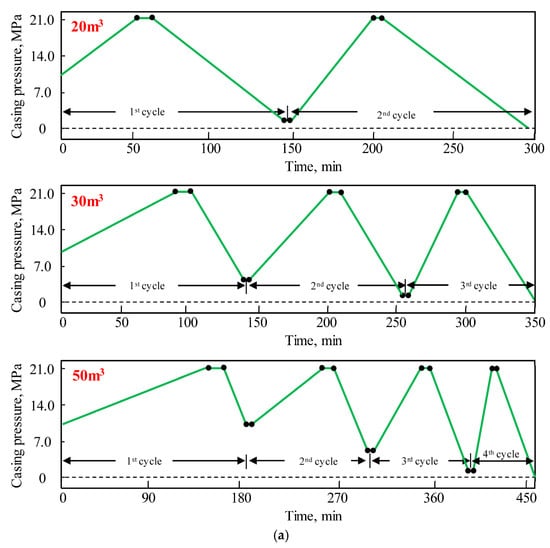 It can also be seen from Figure 10 that when the pit gain is low, the minimum casing pressure of each cycle during the entire kill operation will decrease rapidly. When the pit gain is only 20 m3, the casing pressure decreased to 1.8 MPa at the end of the first kill cycle (i.e., when the first gas discharge is completed). By the end of the second gas discharge, the casing pressure was close to zero. However, when the pit gain is high, this casing pressure drop is not so rapid, but gradual. As observed in Figure 10a, if the mud pit gain increases to 30 m3, the minimum casing pressure at the end of the first kill operation is 5.1 MPa. By the end of the second round of the kill cycle, it dropped to the level at the first round of kill operation in the previous case (i.e., the case where the pit gain is 20 m3). For the case where the pit gain is 50 m3, this phenomenon is more significant. Attributed to the low casing pressure at the end of the initial kill cycle under low pit gain, the gas discharge stage in each kill cycle requires an extremely long duration. However, due to the small volume of kill fluid required in each cycle, the time required for injection of kill fluid is significantly short. On the contrary, when the pit gain is high, the injection time and gas discharge time in kill cycle are opposite to it.