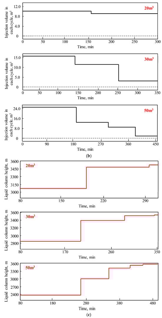 Evolution of kill parameters during the kill operation when the pit gain is 20 m3, 30 m3, and 50 m3, respectively. (a) Casing pressure; (b) injection volume; (c) liquid column height.