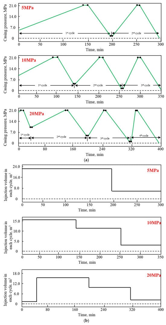 Shut-in casing pressure is another factor affecting the kill parameters of the kill operation in the displacement kill method [53,54]. The effect of shut-in casing pressure on the kill operation in the displacement kill method was investigated, and the results were presented in Figure 11. As can be seen in Figure 11, if the shut-in casing pressure is high, more kill cycles are required. Correspondingly, the duration of the entire kill operation will be long. When the shut-in casing pressure is only 5.0 MPa, only two kill cycles are needed to discharge the gas in the annulus, and the duration of the entire kill operation is 313 min. If the shut-in casing pressure increases to 10 MPa, the number of complete well killing cycles required becomes three, and the duration of the well killing operation is extended to 350 min. When the shut-in casing pressure continues to increase to an astonishing 20 MPa, the required number of complete kill cycles and the duration of the kill operation increases to 4 and 414 min, respectively. This is because a higher shut-in casing pressure means more reservoir gas is locked in the gas column within the annulus. The discharge of more gas from the wellbore will inevitably take longer. Meanwhile, the casing pressure does not decrease instantaneously, but gradually decreases with the reciprocating cycle of fluid injection and gas discharge. Therefore, for the case of higher shut-in casing pressure, more instances of step-by-step pressure reduction (i.e., kill cycles) are required.