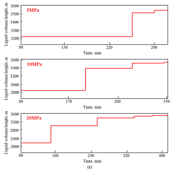 In Figure 7, we can also see that the casing pressure increases continuously during the injection of kill fluid into the annulus in each cycle. This occurs because, as the kill fluid is injected, the space occupied by the gas in the annulus is continuously compressed. Although during this process, a portion of the mixture of the kill fluid and drilling fluid leaks into the reservoir. Taking the first cycle as an example, 13.4 m3 of kill fluid was injected into the annulus, filling a length of 663 m in it. The gas above the liquid level in the annulus is compressed, and the casing pressure increases from 10 MPa to 17.3 MPa during this process. After the throttle valve at the wellhead is opened, the compressed gas inside the annulus is released, causing the casing pressure to decrease accordingly. At the end of the first cycle, the casing pressure decreased to 5.1 MPa, and the distance between the liquid level and the down-hole increased to 2713 m. With the continuous injection of kill fluid during the subsequent kill operation, the position of the gas–liquid interface in the annulus gradually rises. Following four cycles of kill operations, the gas–liquid interface advanced to a position 12 m from the wellhead. Finally, the 12 m long gas column near the wellhead was discharged by injecting the kill fluid while keeping the valve open. The highest and lowest values of casing pressure gradually decrease during each injection exhaust cycle of the entire kill operation.