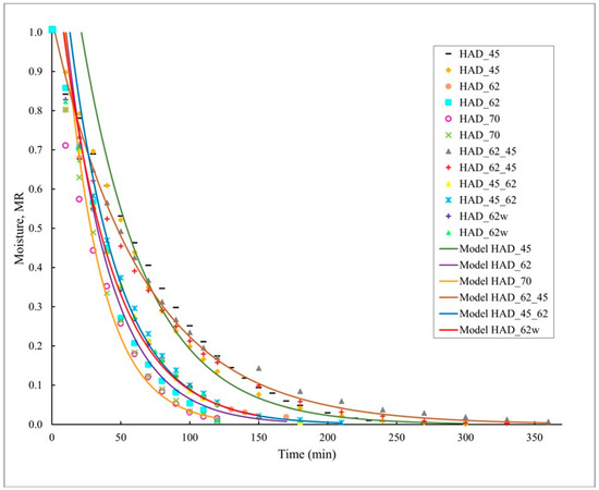 The drying times to achieve 12% (0.136 kg water/kg DW) were predicted by the Lewis model (Equation (4)) for HAD and the Midilli et al. model (Equation (7)) for MWD. In each case, since the models apply only to the falling rate period of the drying, which lasted for 10 and 3 min and corresponded to the constant drying rate for HAD and MWD, respectively, were added to the predicted values.