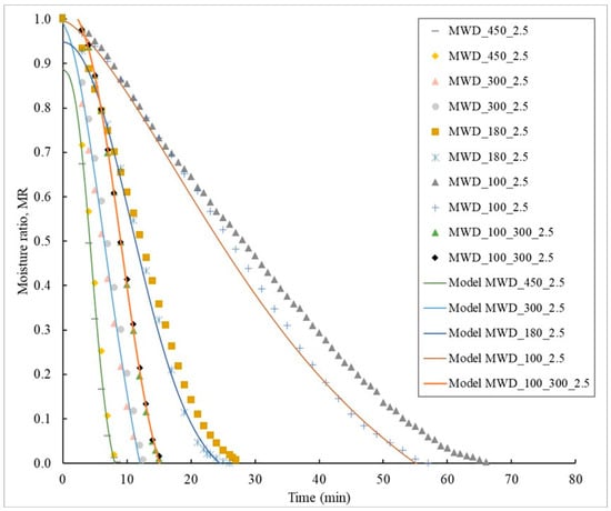 With microwave drying, the drying times to reach 10–12% water in the pomace were between 8 min for 450 W and 62 min for 100 W for 2.5 mm thickness (Figure 2) and 11 min for 300 W and 57 min for 100 W for 1.5 mm thickness (Figure 3). The Lewis and the Henderson and Pabis models did not well fit the experimental data of the microwave drying (R2 < 0.795; and RMSE above 0.012 and 0.16, respectively). Instead, the Midilli et al. model was suitable to describe the experimental data of MWD (Figure 2 and Figure 3, Table 3 and Table 4). and RMSE values from the Midilli et al. model were much lower compared to those of the other two models. It could also be seen that, in general, the higher the power, the better the fits of the Midilli et al. model, reflected in low and RMSE values (Table 3 and Table 4). Tulej and Głowacki [31] used the Page model and they estimated it was suitable to describe the experimental data obtained by HAD of apple pomace at 60 °C with microwave support.