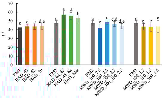 L* values of apple and ginger pomace dried by HAD and by MWD (HAD_62w: unground sample dried by HAD at 62 °C) and raw material (RM1 and RM2). Different letters mean statistically significant differences (p < 0.05).