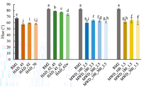 Hue values of the raw materials were higher (p < 0.05) than all respective dried samples. In agreement with the L* results, the HAD dried samples from RM2 (steps and whole sample) also presented higher (p < 0.05) hue values than the MWD samples (Figure 5). There was a similar behavior in h in comparison to L* for HAD at 45–70 °C, and also for these experiments compared to MWD.