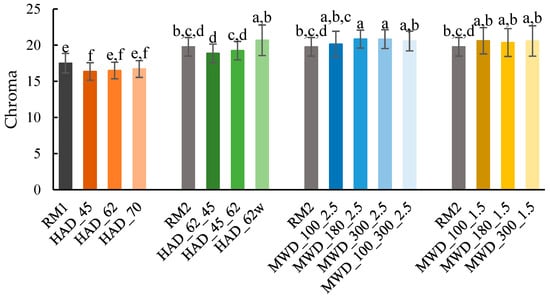 Except for the Chroma value of HAD_62w, the C values of the MWD samples were higher (p < 0.05) than those of HAD samples from the same raw material (RM2) (Figure 6). Nevertheless, the low C values (C < 21) obtained for all MWD and HAD experiments mean that C is not a good parameter to characterize the color of dried apple and ginger pomace.