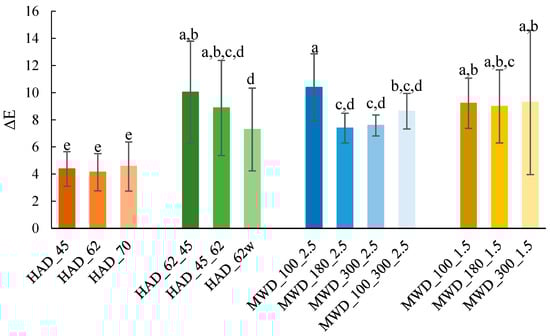 Color difference of the apple and ginger pomace dried by HAD and by MWD (HAD_62w: unground sample dried by HAD at 62 °C). Different letters mean statistically significant differences (p < 0.05).