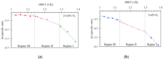 As shown in Figure 3a, the transition temperature between Regimes I and II is ~773 K and that between Regimes II and III is ~883 K during combustion in 21 vol% O2. In Regime II, the gradient is nearly half the gradient of Regime I, as expected from the theoretical findings in the literature [9]. The gradient of Regime III is close to zero.