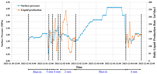 Temperature measurements were taken for 12, 4, 4, 12, 35, and 12 h, corresponding to choke sizes of 0, 5, 4, 2, 0, and 4 mm, respectively, as detailed in Table 3 and Figure 5. However, due to excessive flowback volumes, the DTS data collected under the 5 and 4 mm choke sizes were deemed unreliable and were excluded from the analysis. Instead, the DTS data collected before and after well shut-in with the final 2 and 4 mm choke sizes were selected for detailed analysis.