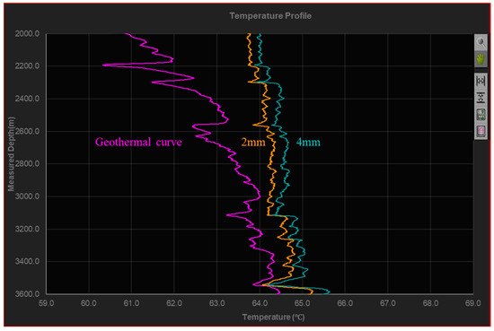 Figure 7 presents a comparison of the measured temperature curves for two different choke sizes against the geothermal baseline. This comparison reveals that the production regime utilizing the 4 mm choke size yields a higher liquid production rate than the 2 mm choke size. The temperature curves show a notable deviation from the geothermal baseline, particularly in the 2200 to 2900 m section of the well. This significant temperature difference indicates that this section is contributing substantially to the overall liquid production.