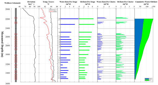 It is inferred that the well is still in the early stages of flowback, where the middle and heel sections of the well are easier to flow back, potentially suppressing flowback from the toe section. This results in most of the oil and water production being concentrated in the middle and heel segments of the horizontal section. The testing results indicate that each perforated stage along the horizontal section contributes to fluid production.