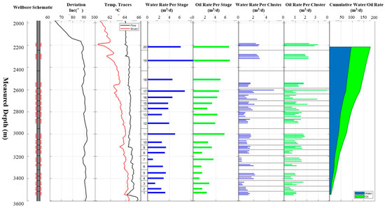 Under both operational regimes, the 10 stages from the middle to the heel are identified as the main oil and water-producing zones for this well. Notably, increasing the choke size does not seem to engage additional fractured stages. In both production scenarios, oil and water are produced concurrently, and the total fluid production does not show a significant correlation with the volume of injected fluid, sand, or the number of perforation clusters in each stage. This analysis suggests that the production profile is more influenced by the well’s structural and flowback characteristics than by variations in choke size or stimulation intensity.
