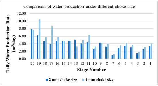 Figure 14 compares oil production between new and old stages under different choke sizes. The data show that under the 2 mm choke size, the average daily oil production for new stages is 3.49 m3, while for old stages, it is 4.66 m3. Under the 4 mm choke size, the average daily oil production increases slightly to 3.98 m3 for new stages and 4.69 m3 for old stages. The older stages, which are mostly located in the middle to heel sections of the horizontal well, generally outperform the new stages in terms of average production.