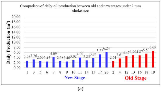 Comparison of oil production between new and old stages under different choke sizes: (a) 2 mm choke size; (b) 4 mm choke size.