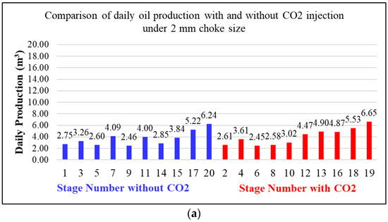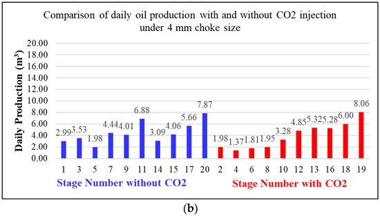 Comparison of oil production with and without CO2 injection under different choke sizes: (a) 2 mm choke size; (b) 4 mm choke size.