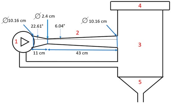 Schematic representation of the hydrodynamic cavitation device: (1) centrifugal pump; (2) cavitation reactor (Venturi-shaped tube); (3) main vessel; (4) lid; (5) discharge.