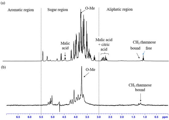 After dialysis (Figure 2b), the signal of bound rhamnose was present at δ 1.1(9) ppm, given by hydrogens of the methyl group of rhamnose. The intensity of the peak was relatively low compared to the other signals, meaning that only a small portion of the polysaccharides extracted was rhamnose. The main peak in the dialyzed spectrum (Figure 2b) was instead at δ 3.7, given by the methyl group linked at C6 in the galacturonic acid moiety of pectic polysaccharides. Its presence confirmed that the polysaccharides extracted contained an important portion of pectic polysaccharides.